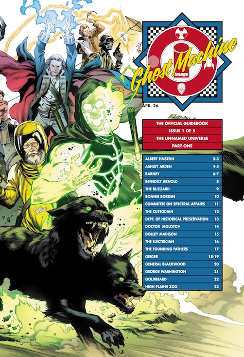 GHOST MACHINE: THE OFFICIAL GUIDEBOOKS spotlight more than 120 characters, teasing future storylines and major events across GHOST MACHINE’S four interconnected universes, including those of THE UNNAMED and the heroes and villains spanning the American timeline found in GEIGER, REDCOAT, and FIRST GHOST; ROOK: EXODUS and its sweeping science-fiction epic; and HYDE STREET and its horrific home to the terrifying Residents of a mysterious, nightmarish dimension. Plus, don’t miss THE UNBELIEVABLES, where extraordinary figures hide in plain sight, including THE ROCKETFELLERS, HORNSBY & HALO, the upcoming THE TRILLION DOLLAR KID, and many more soon making their debut.