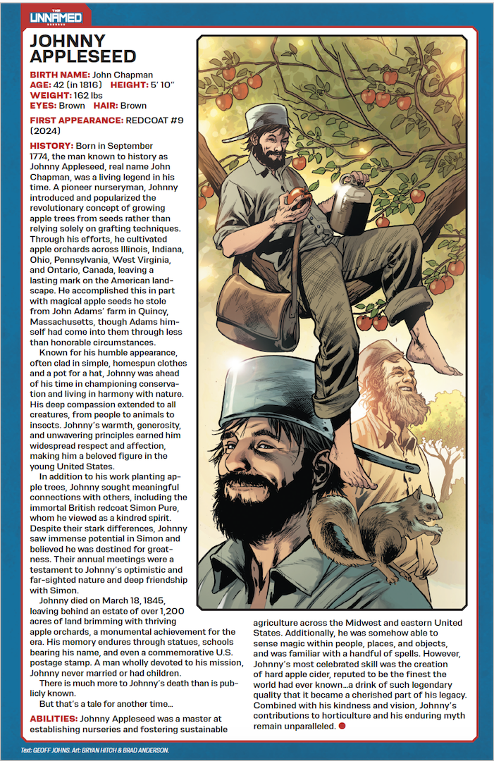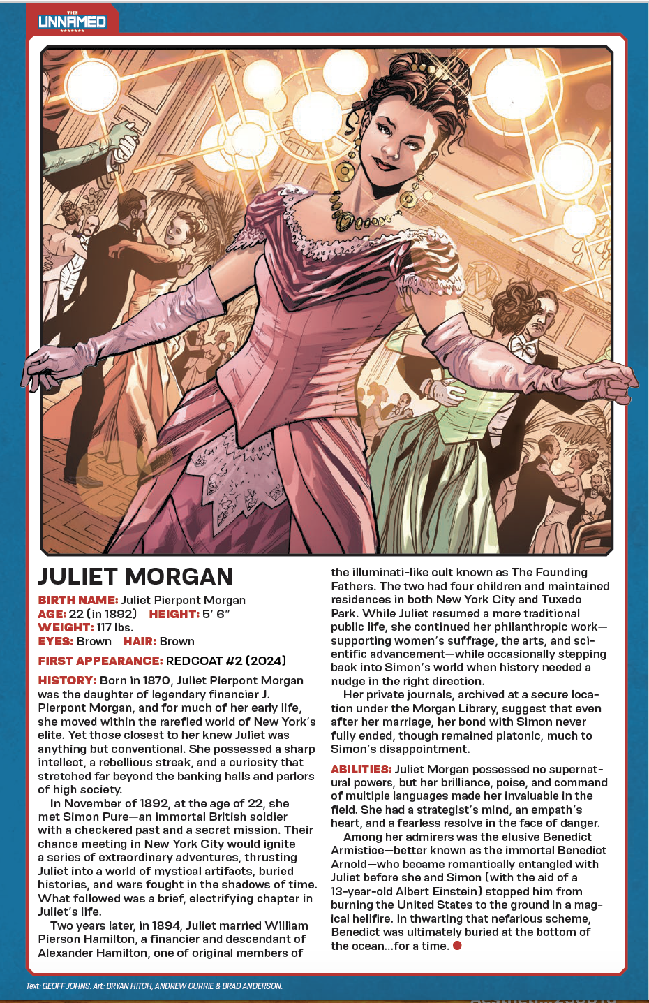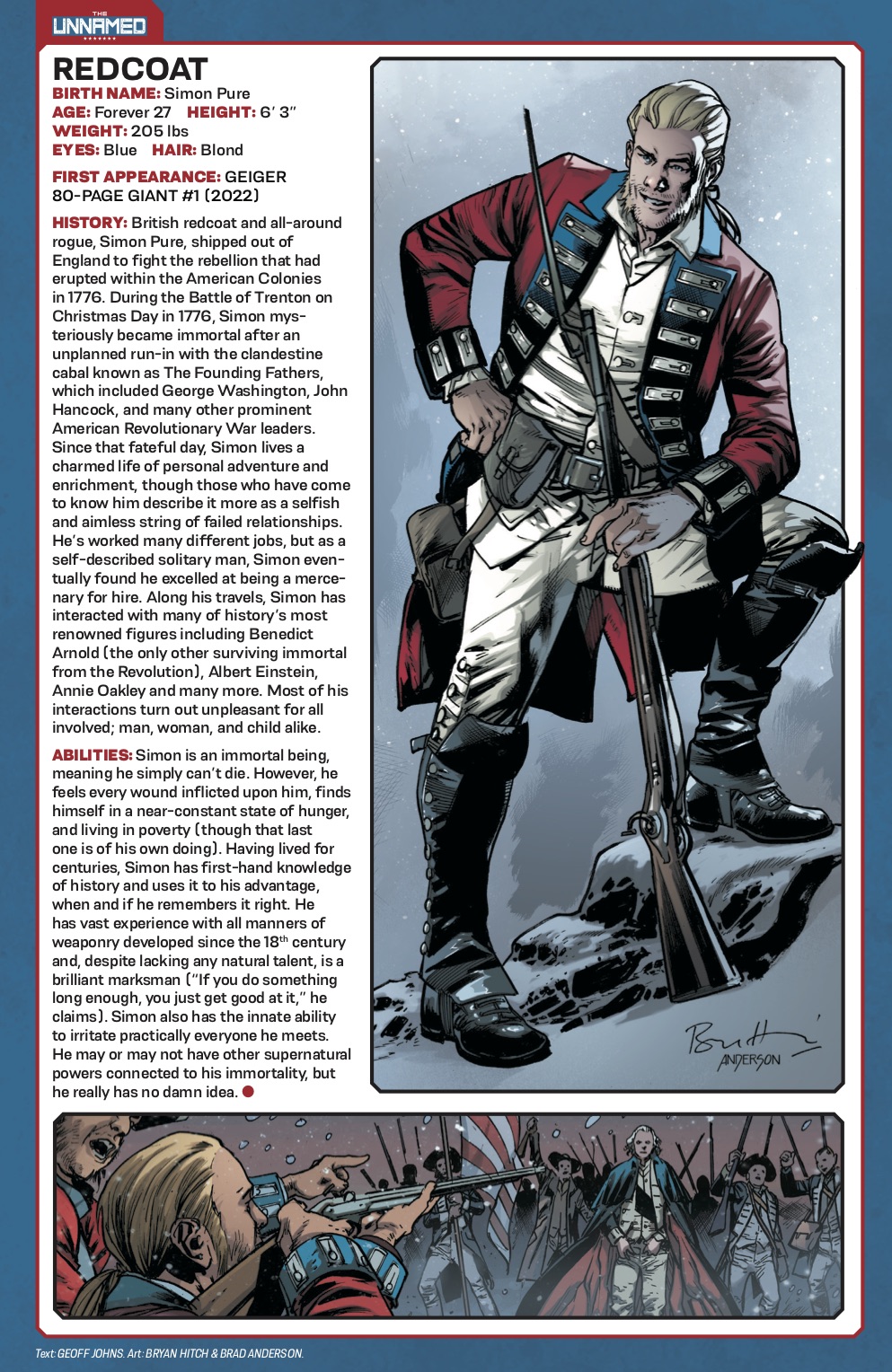 Immortal. Mercenary. Kind of a tool. Meet Simon Pure, the newest UNNAMED hero, created by comic all-stars Geoff Johns and Bryan Hitch, now collected in a deluxe hardcover edition featuring exclusive extras. A British soldier and all-around rogue, Pure’s led quite an exciting life. Or lives, really. After a failed assassination of General George Washington at the Battle of Trenton in 1776, Simon stumbled upon hooded figures performing a bizarre ritual that accidentally gave him immortality. Since that fateful day, Simon has died and returned countless times over, rubbing elbows (and sometimes fists) with history’s most renowned figures, including his nemesis Benedict Arnold, Albert Einstein, real-life serial killers the Bloody Benders, American icon Johnny Appleseed, Wild West sharpshooter Annie Oakley, and many more. But none of those encounters prepare him for The Northerner—a mysterious time-traveler who needs Simon’s help to prevent the Confederacy from winning the Civil War. That is, if the two can find a way to work together instead of killing one another. This volume closes out with a trip to Washington, D.C., as Simon encounters a haunting in the White House in a prelude to the FIRST GHOST miniseries. Collects Redcoat #1-14 and includes behind-the-scenes, in-progress art and commentary from the creative team