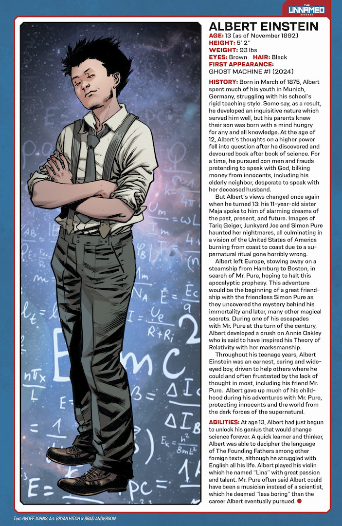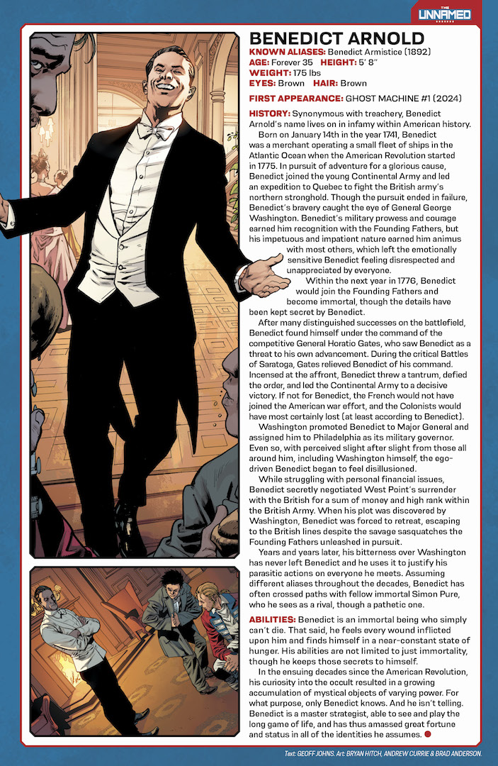 SERIES PREMIERE! Immortal. Mercenary. Kind of a tool. Meet Simon Pure, the newest UNNAMED hero, created by comic all-stars GEOFF JOHNS (GEIGER) and BRYAN HITCH. British redcoat and all-around rogue, Simon mysteriously became immortal in 1776 after a run-in with the clandestine cabal known as the Founding Fathers, which included George Washington, John Hancock, and many other prominent American Revolutionary War leaders. Since that fateful day, Simon has led a life of adventure and avarice, rubbing elbows (and sometimes fists) with many of history’s most renowned figures, including his nemesis Benedict Arnold, Albert Einstein, Annie Oakley, and many more. One thing they all agree on: they never want to see him again! But what are the true origins and extent of Simon’s power and the mysterious organization behind them? And how has it secretly shaped America and the world? Simon’s on a quest to find out! Don't miss out this new entry in the exciting Ghost Machine rollout—and it's 34 pages of story for only $3.99!